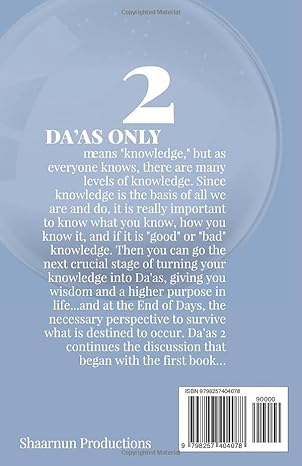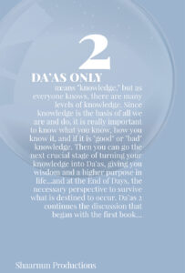Da’as only means “knowledge,” but as everyone knows, there are many levels of knowledge. Since knowledge is the basis of all we are and do, it is really important to know what you know, how you know it, and if it is “good” or “bad” knowledge. Then you can go the next crucial stage of turning your knowledge into Da’as, giving you wisdom and a higher purpose in life…and at the End of Days, the necessary perspective to survive what is destined to occur. Da’as 2 continues the discussion that began with the first book…